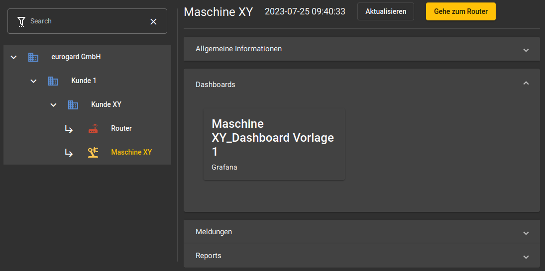 In der Portalansicht werden die Dashboards zu einer Maschine angezeigt. Um die Dashboards an dieser Stelle sichtbar zu machen, muss man die Zuordnung in der Dashboard Details zuweisen. Hierzu gibt es zwei Wege: