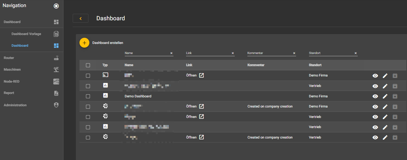 Unter diesem Navigationspunkt haben Sie die Möglichkeit, Dashboards zu erstellen und zu verwalten. Dashboards ermöglichen die übersichtliche Darstellung von Mess-, Steuerwerten und Meldungen einer Maschine.