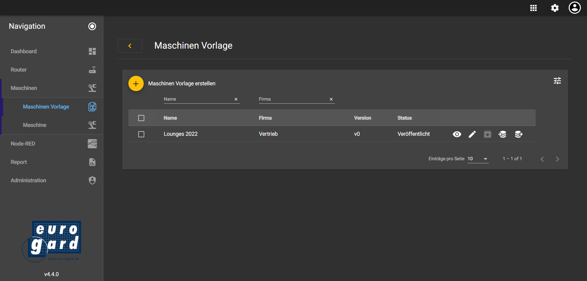 Sobald die Maschinen-Vorlage fertiggestellt ist, kann eine Maschine erstellt werden. Diese Maschine basiert, auf der zuvor erstellten und bearbeiteten Maschinen-Vorlage.