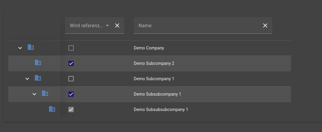 Der Benutzer hat danach jeweils Zugang auf den kompletten Baum der zugewiesenen Firmen. Wird eine Firma wird Unterfirmen ausgewählt, hat der Benutzer danach automatisch Zugriff auf die Unterfirmen.