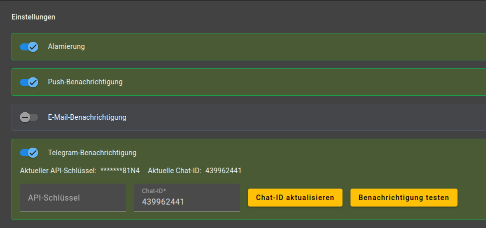 - Telegram - es wird ein API-Token und eine ChatID benötigt