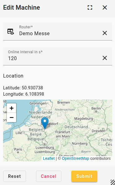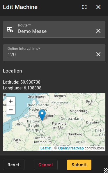 Mit Klick auf öffnet sich ein neues Dialogfenster. Die Maschine kann hier einem Router zugeordnet werden. Zudem kann der Standort der Maschinen festgelegt werden. Eine solche manuelle Eingabe der GPS-Koordinaten überschriebt die Koordinaten, die zuletzt vom Router gesendet wurden. Wenn dann der Router neue GPS-Koordinaten sendet, werden die manuell eingegebenen Breitengrad und Längengrad überschrieben. Höhe und Geschwindigkeit können nicht manuell eingegeben werden.
