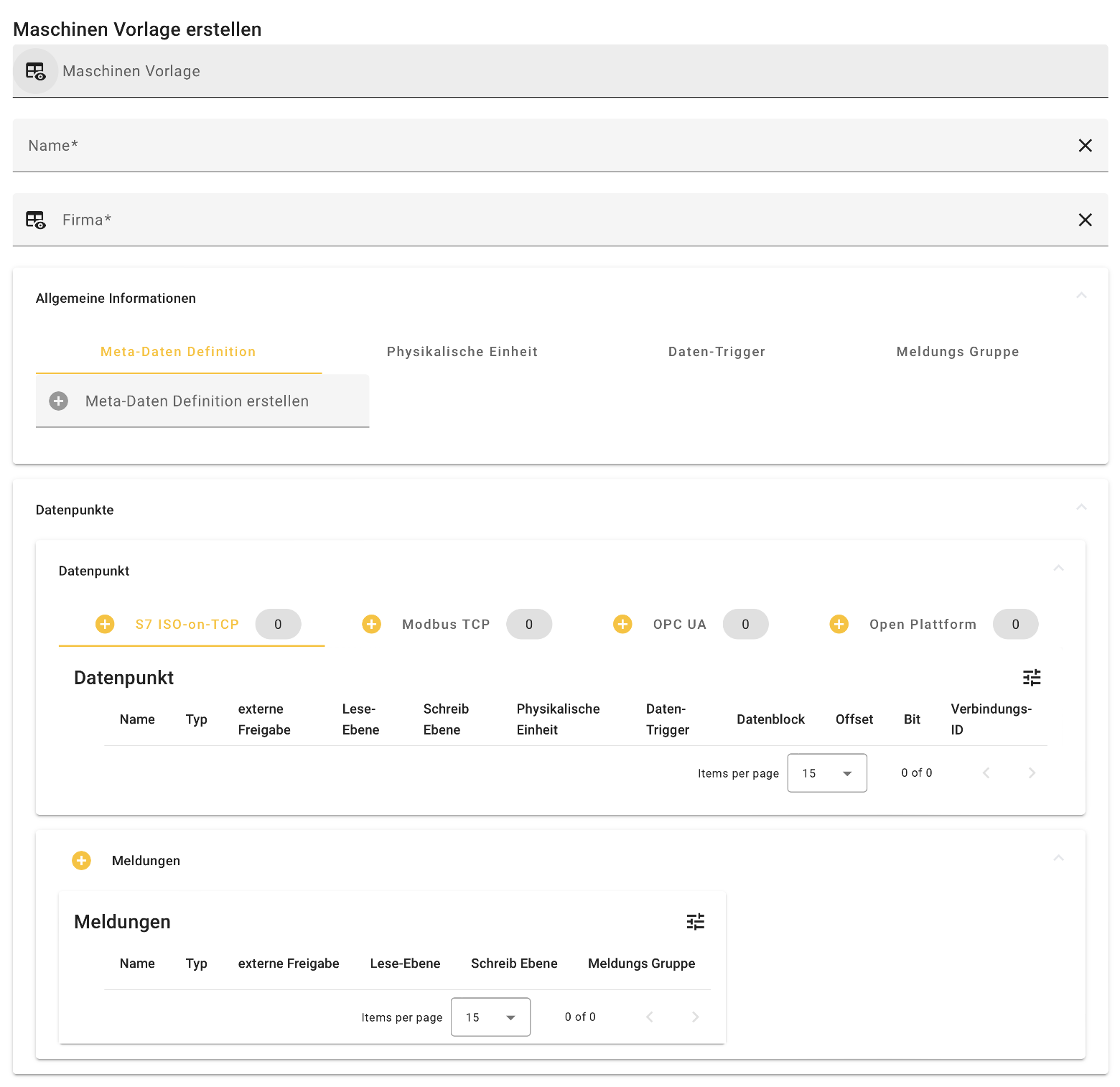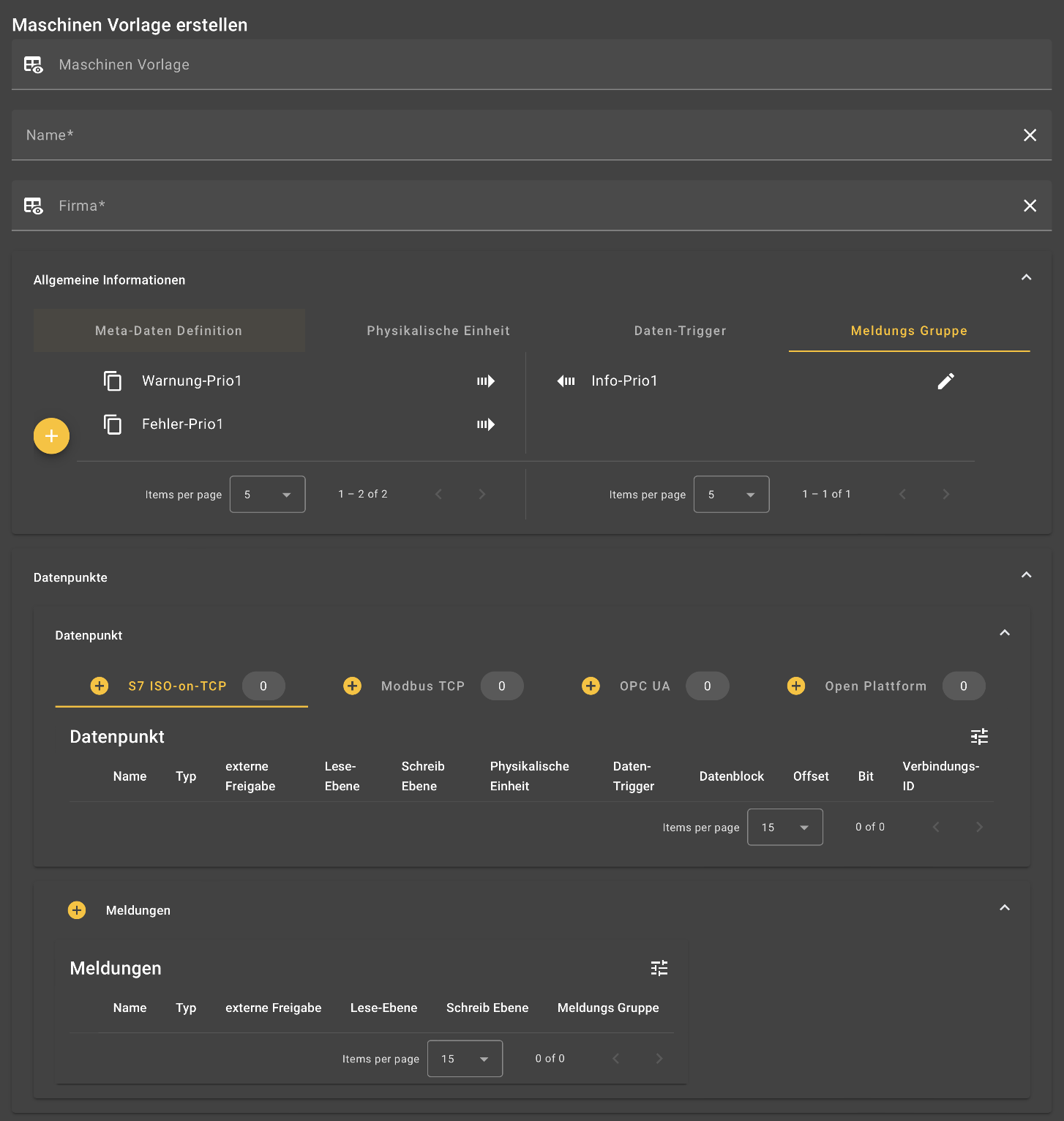 Mit einem Klick auf den Button können Einheiten/Trigger/Meldungsgruppen über ein Dialogfenster erstellt werden. Nach der Erstellung werden diese auf der rechten Seite des jeweiligen Tabs angezeigt und sind somit der zu erstellenden Maschinen-Vorlage zugeordnet.