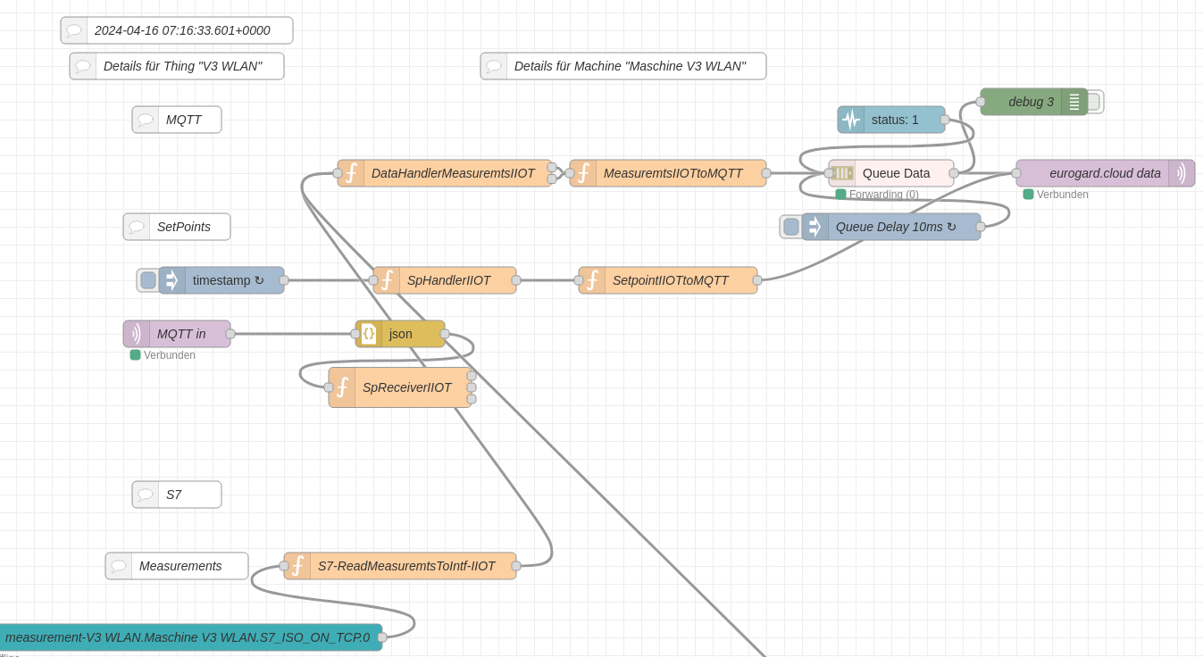 Ein Node-RED-Flow ist eine Sammlung von Knoten, die miteinander verbunden sind, um eine bestimmte Aufgabe zu erfüllen. In diesem Kontext wird ein Flow automatisch von der m2v Plattform generiert, wenn eine Anfrage gestellt wird. Die Generierung basiert auf den Maschinen, die in der m2v mit dem Router verbunden sind.