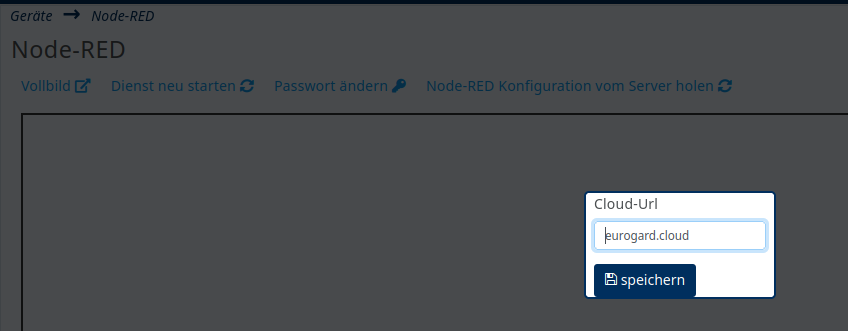 Die Konfiguration von Node-REDs kann über die Router-Benutzeroberfläche unter "Geräte" → "Node-RED" vorgenommen werden. Um die Konfiguration von der m2v Plattform zu beziehen, muss unter "Node-RED Konfiguration vom Server holen" die entsprechende URL (nur die Domain, ohne https://) eingegeben werden.