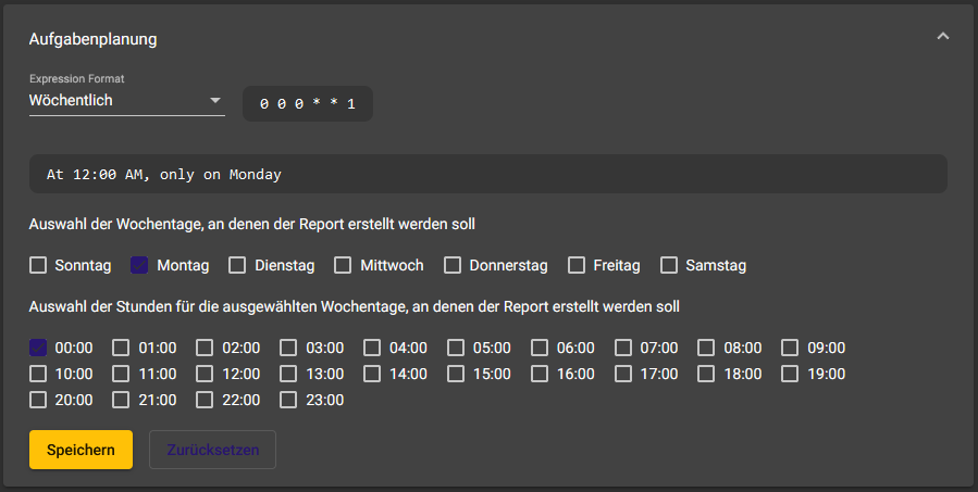 Die Konfiguration für einen Report, der nur jeden Montag (wöchentlich) um 00:00 Uhr (12:00 AM) generiert wird, sieht wie folgt aus: