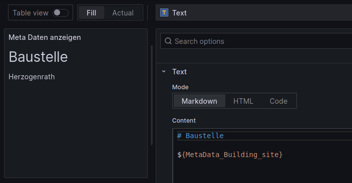 Für Dashboards, die an einer Maschine hängen ist es nun möglich, die MetaDaten der Maschine über eine Variable im Grafana Dashboard anzuzeigen. Hierfür wird das Schema ${MetaData_ENGLISCHER_KEY} verwendet, wobei ENGLISCHER_KEY mit der englischen Übersetzung der MetaDaten Definition ersetzt werden muss.